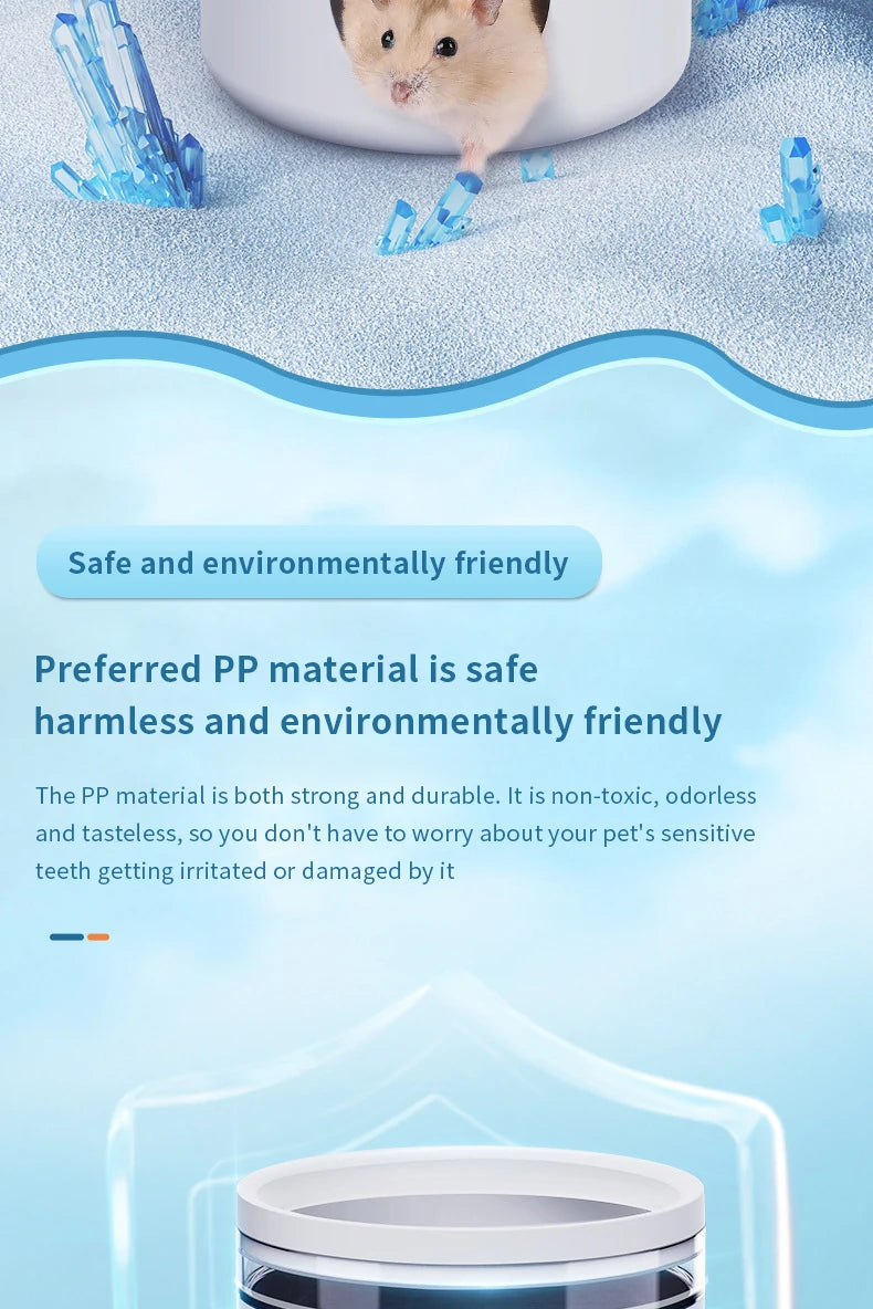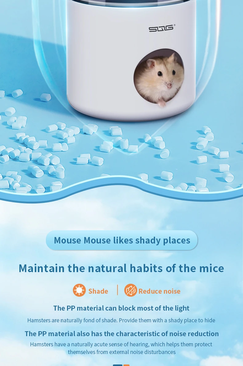 Safe, environmentally friendly, and resistant to biting. PP material is preferred, which is safe, harmless, and environmentally friendly. PP material has the advantages of strength, rigidity, non-toxic, odorless, and tasteless, so you don't have to worry about scratching or biting your teeth.Rats and mice like shady places. To maintain their natural habits, the cooling cabin is designed to block light and reduce noise. PP material can block most of the light, and hamsters have a natural preference for shade, providing them with a cool hiding place. PP material also has its noise reducing properties. Hamsters have a sensitive hearing, which helps them block external noise interference